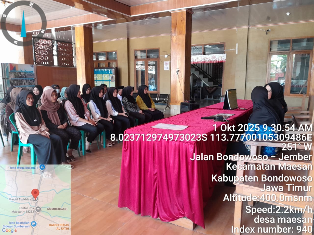 Puskesmas Maesan malalui Penanggung Jawab Kesehatan Reproduksi rutin menggelar Kelas Calon Pengantin (Catin), atau Bimbingan Perkawinan, untuk membekali calon pengantin dengan pengetahuan dan keterampilan yang diperlukan untuk membangun keluarga sehat dan harmonis seperti yang dilaksanakan pada Hari Rabu, 01 Oktober 2025 di Balai Desa Maesan. Kegiatan ini meliputi edukasi kesehatan reproduksi, gizi, pemeriksaan kesehatan pranikah, dan pencegahan stunting, sebagai upaya menciptakan generasi sehat dan mencegah pernikahan dini serta kekerasan dalam rumah tangga.